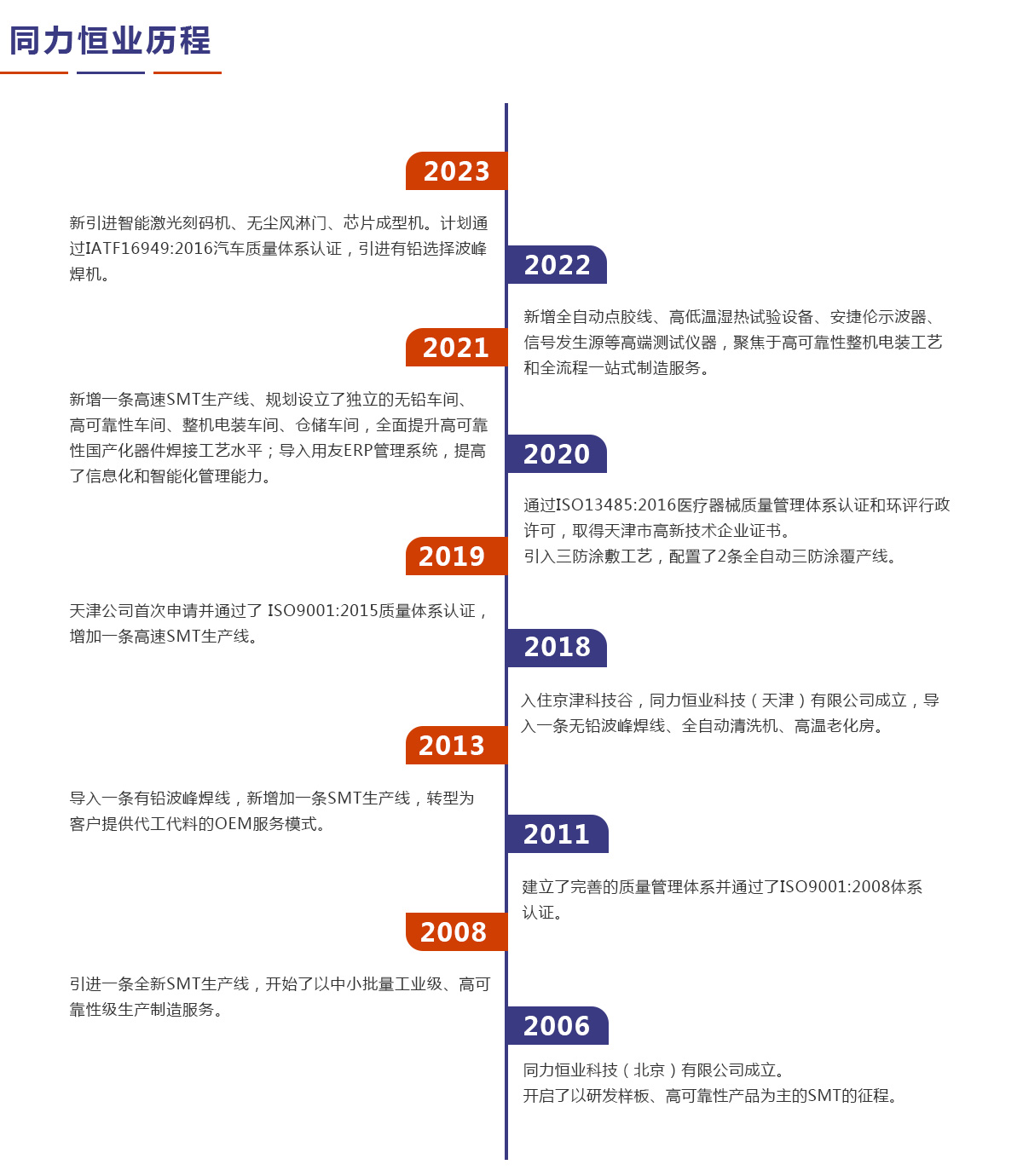 同力恒業(yè)科技成立于2006年,專業(yè)從事電子制造服務(EMS),專注于為客戶提供產(chǎn)品開發(fā)、工藝設計、物料配套、精密貼裝、插件焊接、三防涂敷、整機電裝、測試老化以及包裝運輸、售后維修等整個供應鏈解決方案。公司定位于高可靠性及中高端產(chǎn)品電子制造服務,在通訊導航、儀器儀表、醫(yī)療設備、汽車電子等領(lǐng)域具有豐富的一站式制造服務經(jīng)驗。